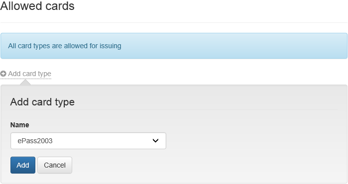 By default, issue is allowed for all smart card types added to Axidian CertiFlow. To set up the policy to issue smart cards of a certain type, click Add card type.