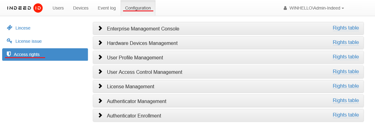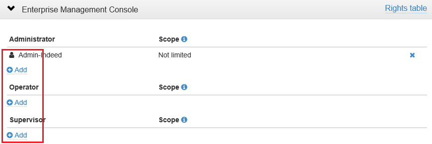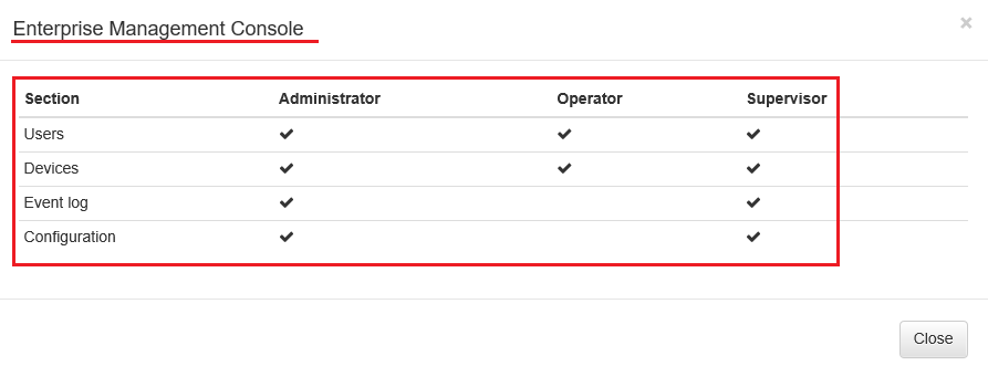 Access rights management is carried out via assigning a user to the action. Access rights are additionally subdivided to the following levels for each action: “Administrator”, “Operator”, “Supervisor”.