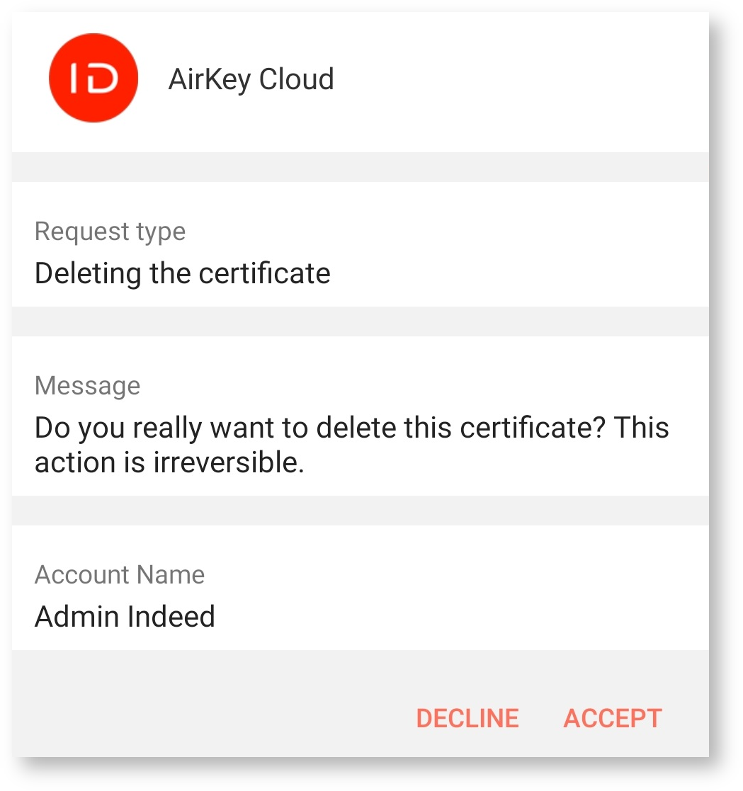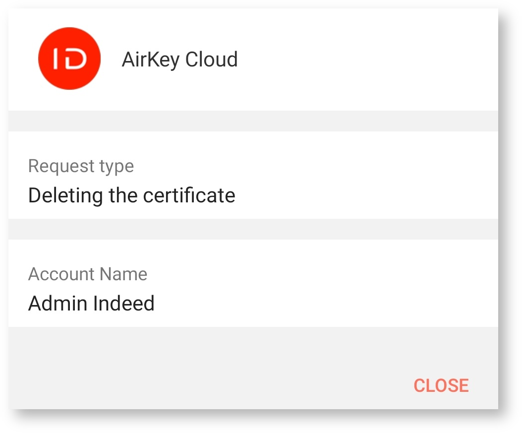 8. When trying to remove an AirKey authenticator for a user, the latter receives a push notification of registered key removal. The key is removed from the application after the operation is confirmed. Configuration: