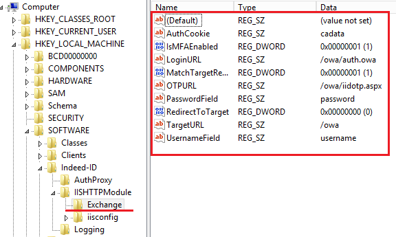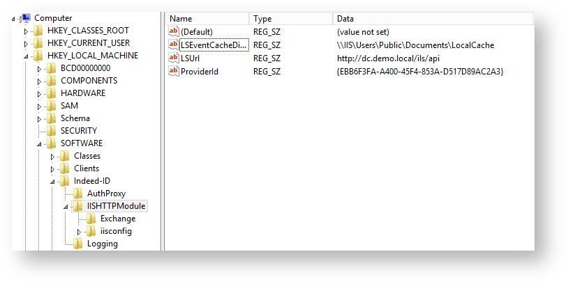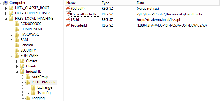 - Create a key named IISHTTPModule in HKEY_LOCAL_MACHINE\SOFTWARE\Indeed-ID section. In this key, create the following: