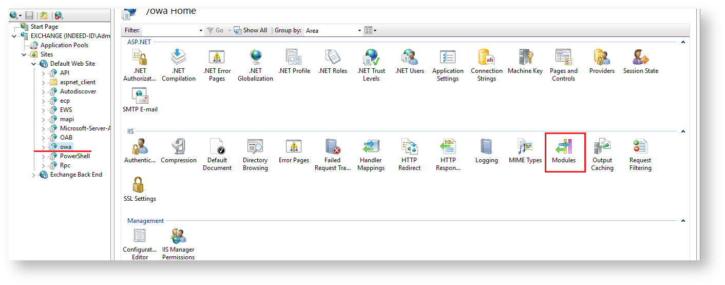 - Open the application (owa for Outlook Web Access) that is to use IIS Extension in IIS Manager and switch to Modules section.