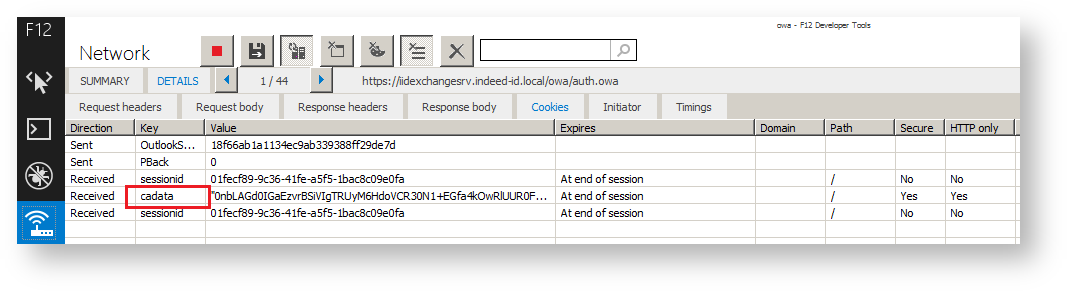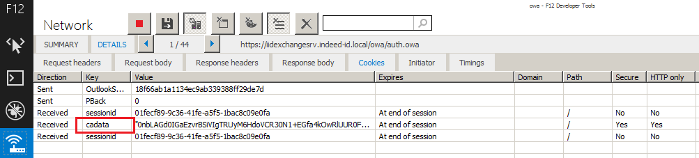 - AuthCookie – string parameter. This defines the name of cookie that is used for authentication in the target application. This is defined experimentally for each application. The parameter value might be obtained in F12 IE Developer Toolbar. To do so, proceed as follows: