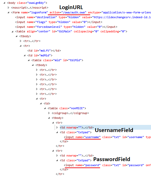 The values of LoginURL, PasswordField, UsernameField parameters reside in the authentication form of the target application. You can obtain those with Internet Explorer F12 Developer Tools, for example.