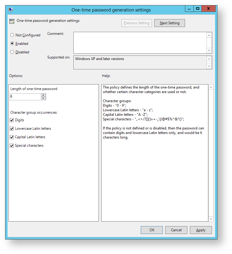 The policy applies to Indeed servers. It allows to configure one-time password length and usage of character groups for password generation.