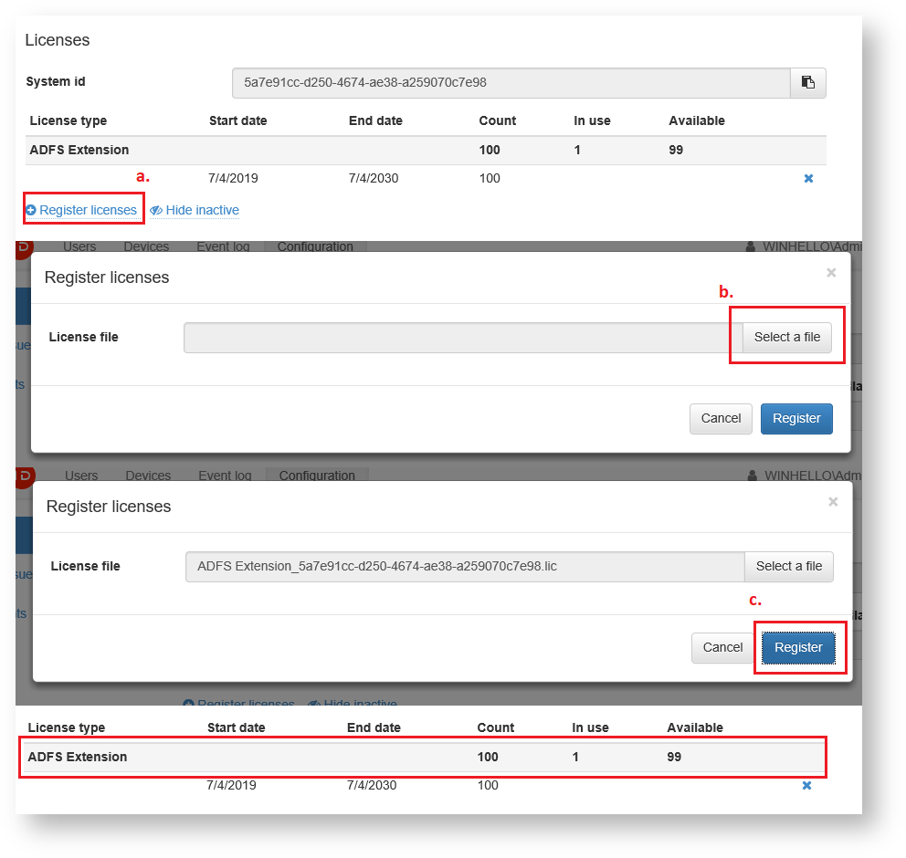 3. Click the “Register licenses” button (a.).