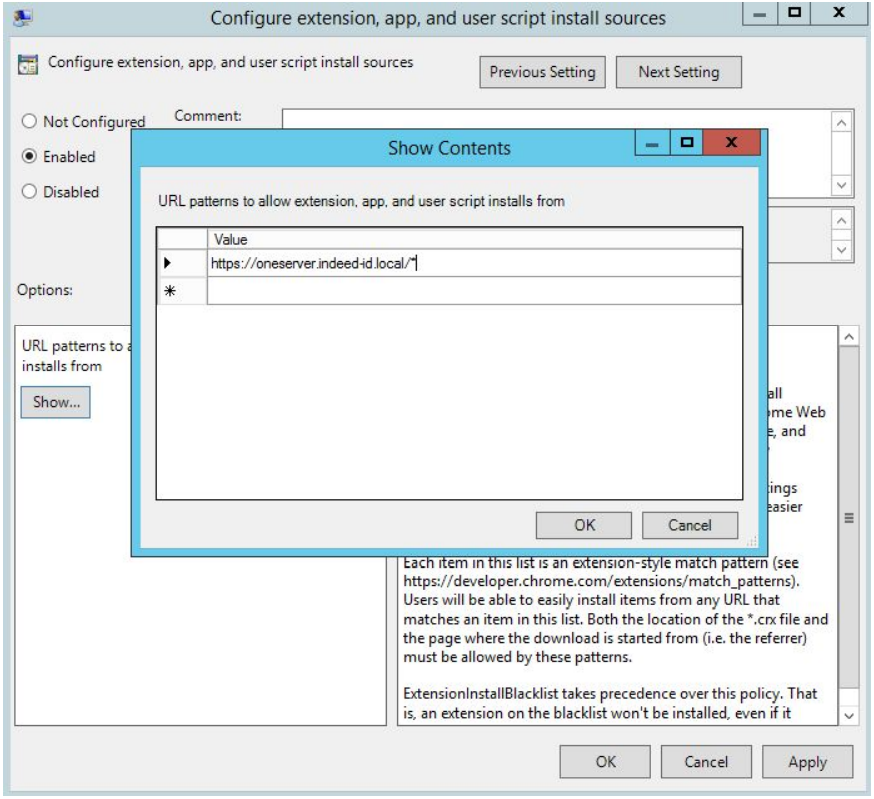 - Enable the Configure extension, app, and user script install sources policy and indicate the address of the server, where the chromeplugin web application, created at step 2, is deployed. Save the changes.