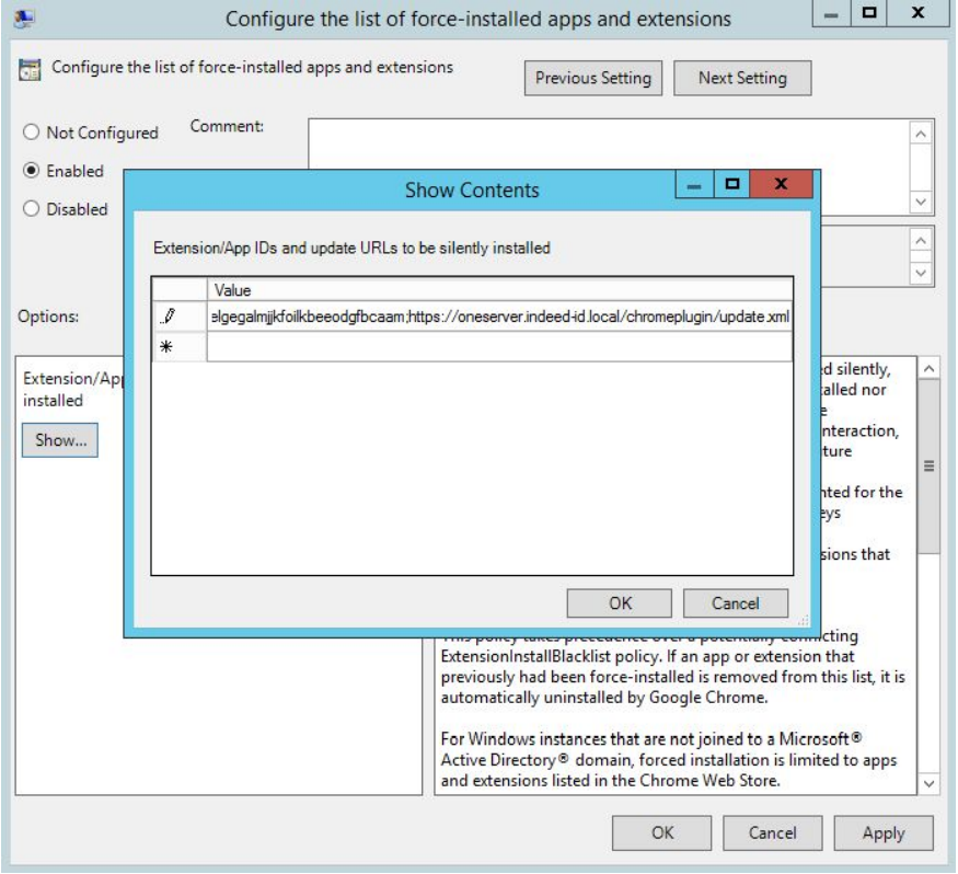 - Enable the Configure the list of force-installed apps and extensions policy and define the application identifier (indicated in the .crx file name) and path to .xml file in the folder of chromeplugin web application, created at step 2. Save the changes.