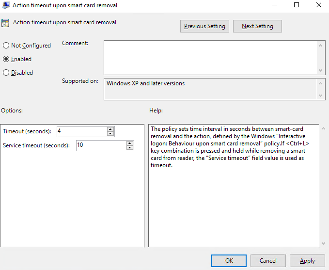 The Windows Logon® policy determines the duration of the standard and service timeout following the removal of an authentication device. You can use this policy to set the time period (in seconds) between the removal of smart card and the performance of action in line with the Windows policy − Interactive logon: Smart card enhanced removal behavior. Standard timeout option prevents automatic system lockout in the event of an accidental removal of an authentication device.