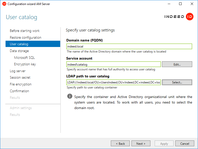 Edit button and add relevant user account information. - LDAP path to the directory − specify the path to the user directory. Click the Select button and choose a relevant container or an entire domain.