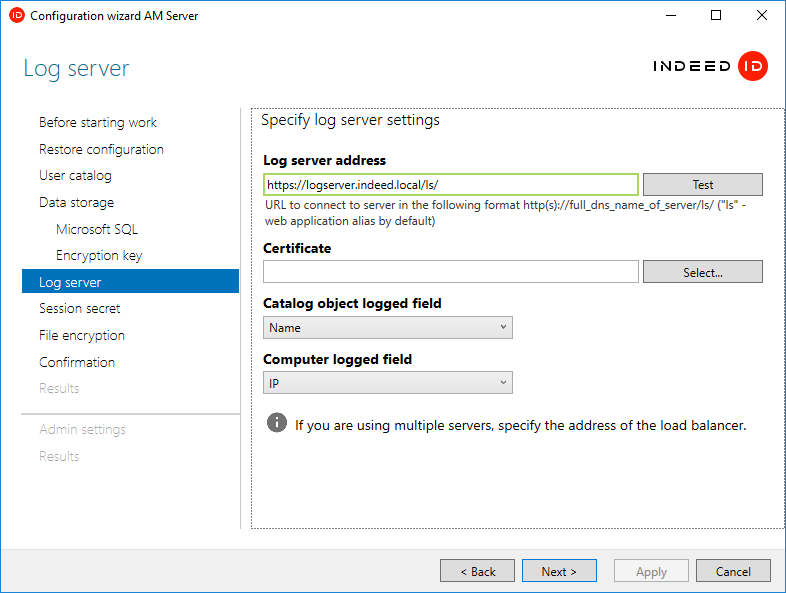 - Log server address − URL for server connections presented in the following format: http(s)://full_dns_server_name/ls/ (for example, http://logserver.demo.local/ls/).
