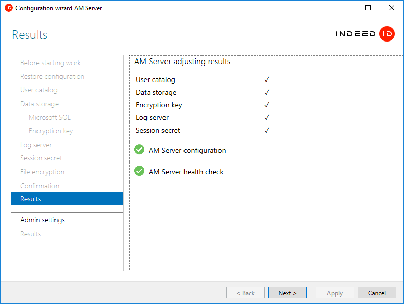 - The Results step. At this step, you can check the settings and test the Axidian AM Server connection.