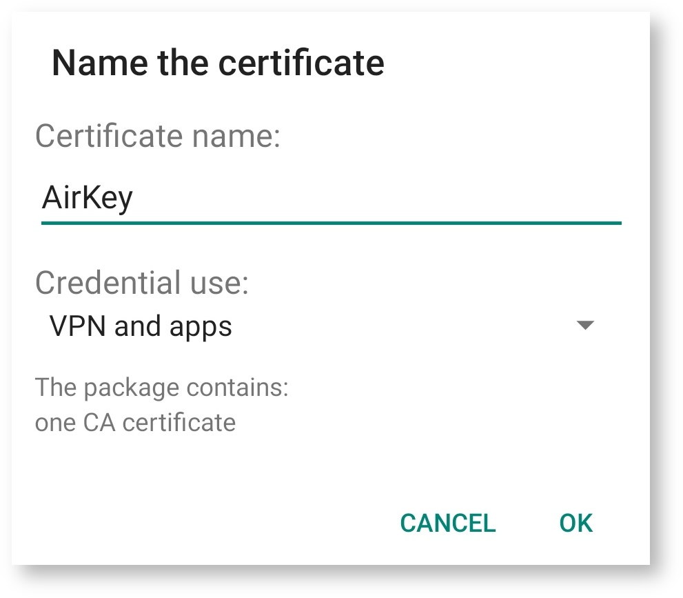 2. Example of prompt to install a certificate on Android devices. To install, specify name for the certificate and select “VPN and applications” in the “Usage” section.