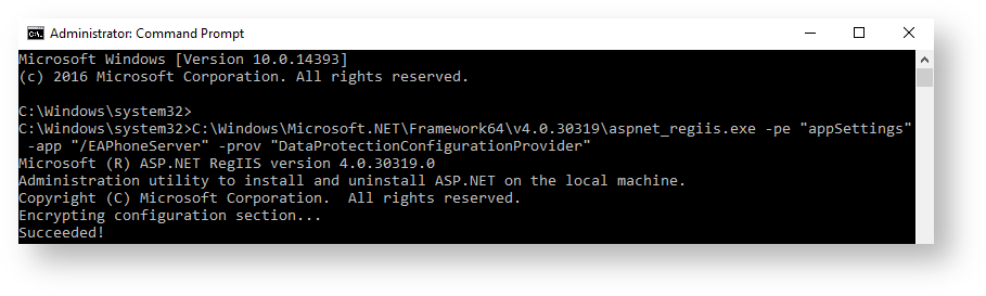 C:\Windows\Microsoft.NET\Framework64\v4.0.30319\aspnet_regiis.exe -pe "appSettings" -app "/EAPhoneServer" -prov "DataProtectionConfigurationProvider"