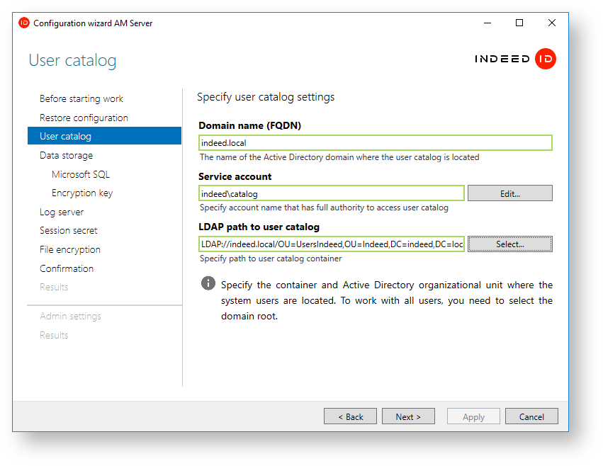 Example<adUserCatalogProviders> <adUserCatalogProvider id="UserId" serverName="indeed.local" containerPath="DC=,DC=local" userName="IndeedCatalogUser" password="Q1q2E3e4"/> </adUserCatalogProviders>