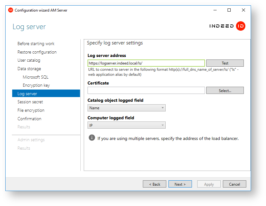 - At the Log Server step, please add the following information: Note. To avoid errors during connection testing, make sure you have completed full customization of your log server settings and have properly configured the database, or have a pre-installed EventLog component. If your log server is not ready, you can skip this step.