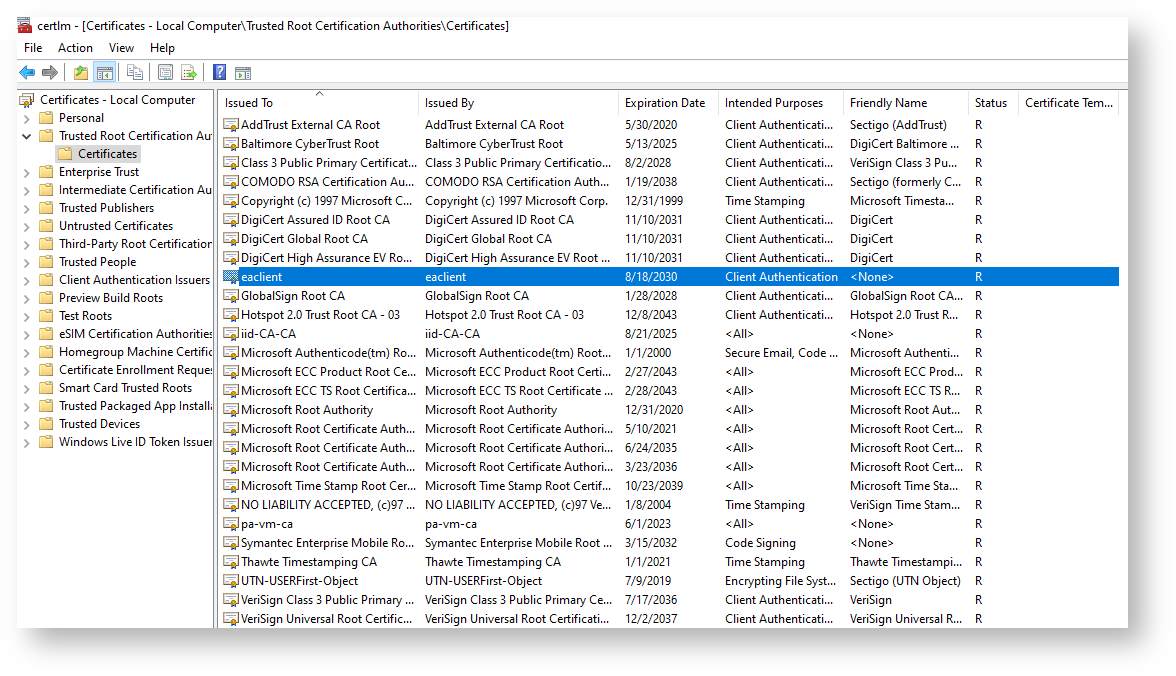 Install the certificate to this folder: Local machine\Trusted Root Certification Authorities
