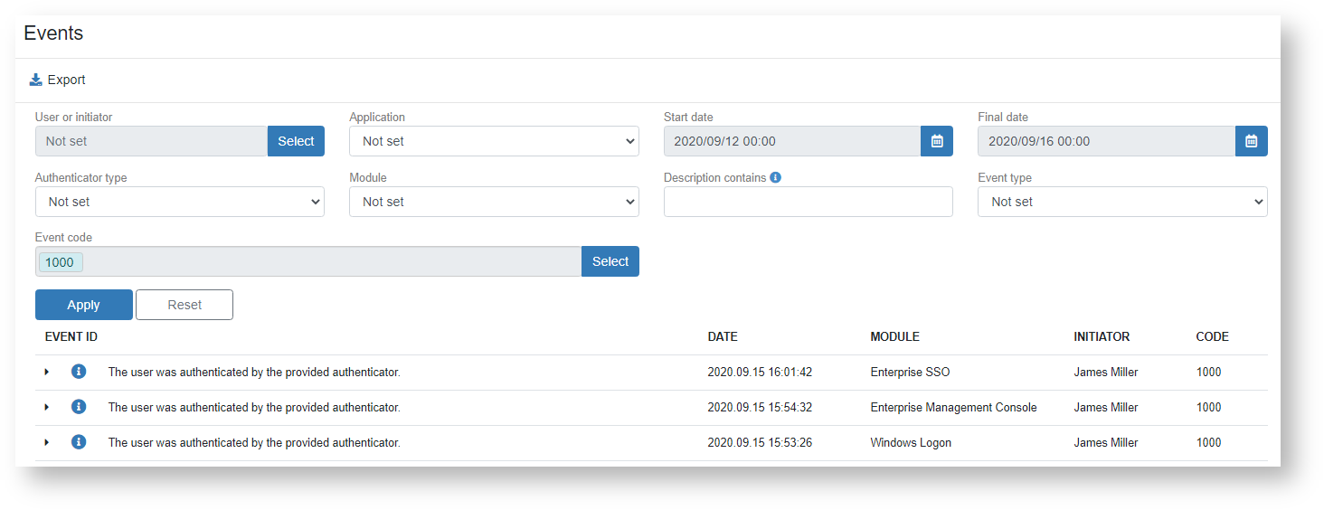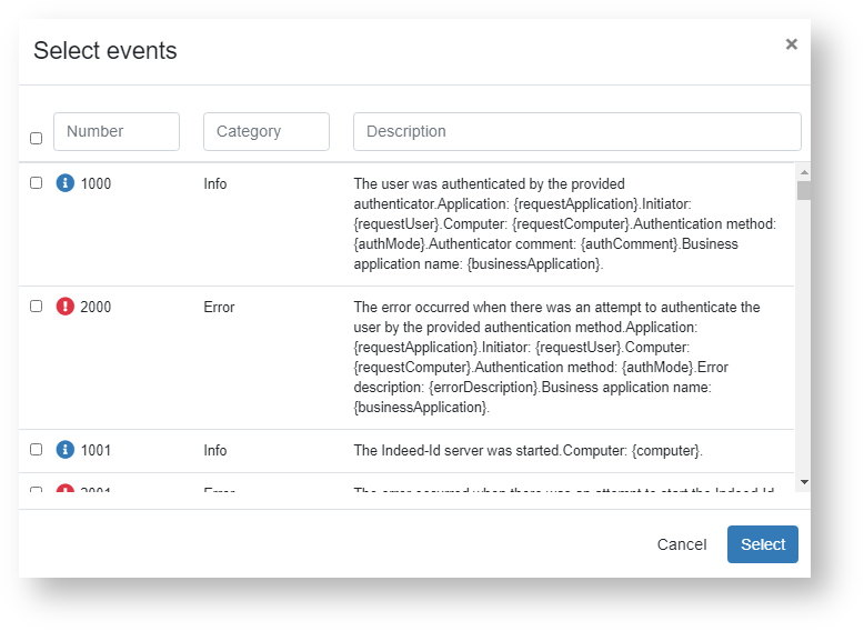 - Authenticator type - filter events by the selected Indeed AM authenticator.