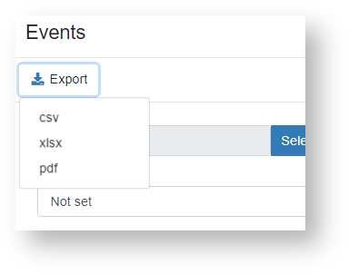 3. To export events, click the icon in the right part of the table header. Events can be exported to csv, xlsx or pdf file.
