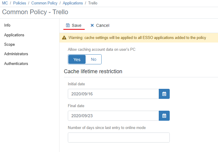 This option allows you to enable user data caching on your local computer for the Indeed AM ESSO Agent and Windows Logon apps. If this option was enabled for apps, you can log in by using the authenticator even if you do not have a physical network connection. In this case, cached user data will be used.
