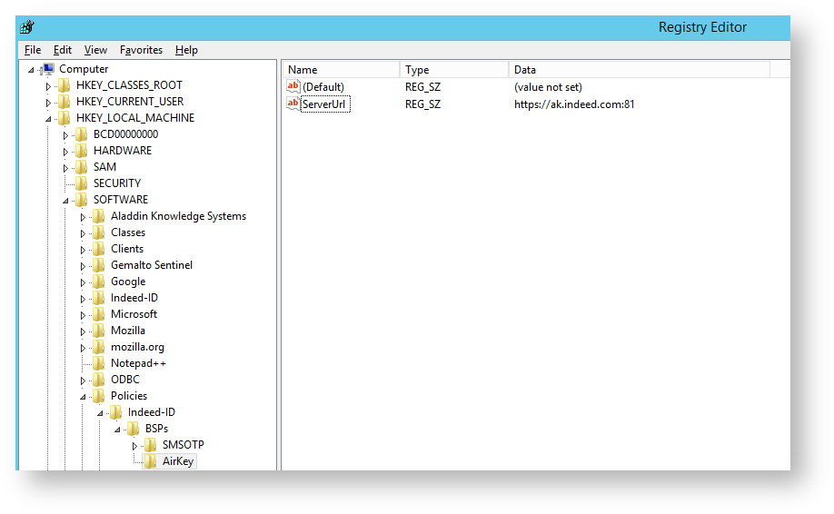 - Create AirKey key with nested value in HKEY_LOCAL_MACHINE\SOFTWARE\Policies\Indeed-ID\BSPs section.