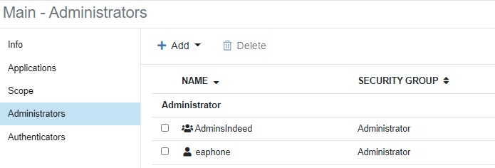 2. Go to the Administrators tab and assign administrator rights to a service user who has access to the Indeed AM EaPhone Server.