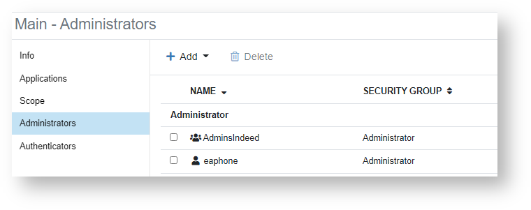 - Go to the Administrators tab and assign administrator rights to a service user who has access to the Indeed AM EaPhone Server.