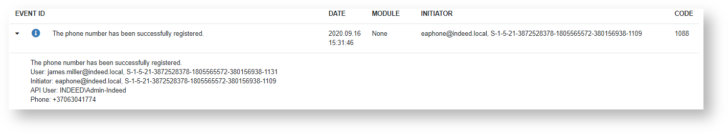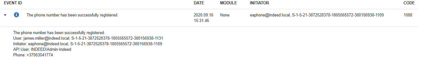 Upon successful registration of the provider, an event with a unique ID − 1088 will be generated. The event body includes the following parameters: