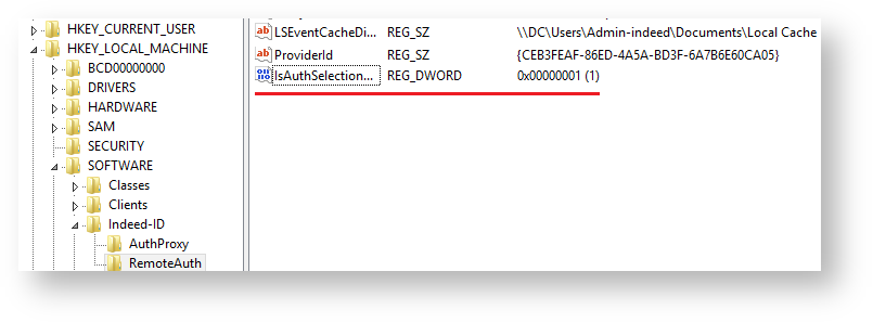 - Create DWORD parameter named IsAuthSelectionEnabled in the HKEY_LOCAL_MACHINE\SOFTWARE\Indeed-ID\RemoteAuth section of Windows registry.
