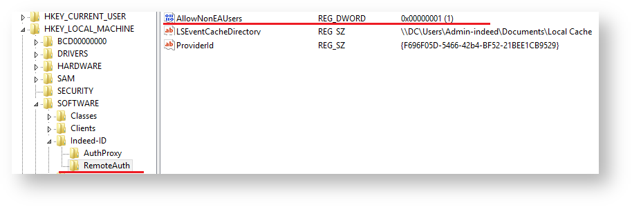 -  Create DWORD parameter named AllowNonEAUsers in the HKEY_LOCAL_MACHINE\SOFTWARE\Indeed-ID\RemoteAuth section of Windows registry.