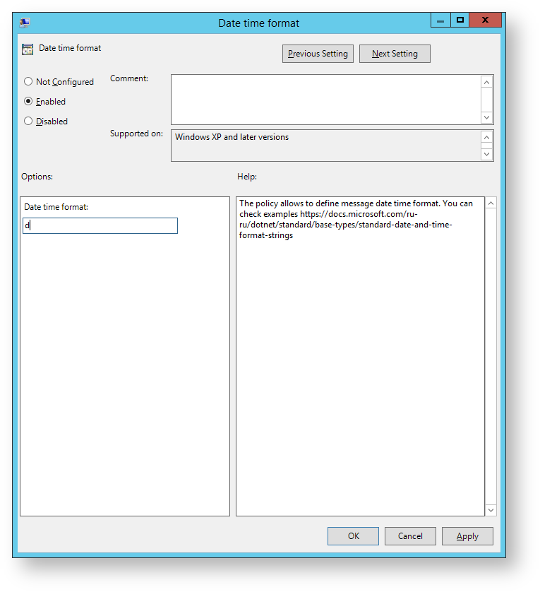 The policy makes it possible to define the settings of date display in the message. Format examples can be viewed here: https://docs.microsoft.com/dotnet/standard/base-types/standard-date-and-time-format-strings