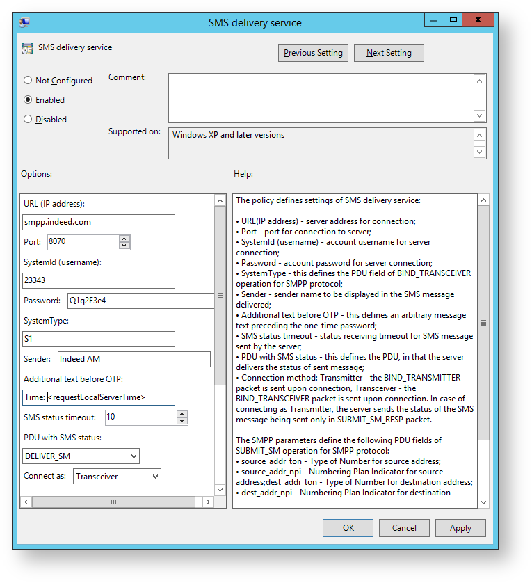 The policy applies to Indeed servers. It allows to configure the following settings to use with SMS server: