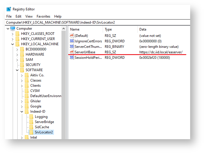 - Go to HKEY_LOCAL_MACHINE\SOFTWARE\Indeed-ID\SrvLocator2.