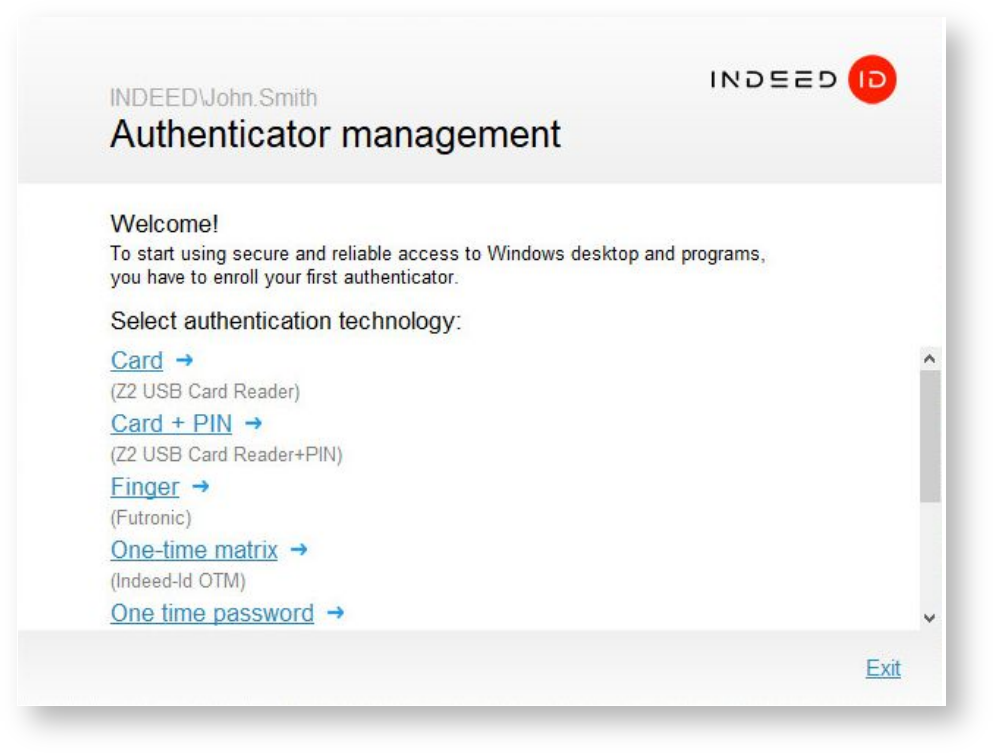 The Indeed AM Windows® Logon product supports more than 20 modern authentication technologies. These are: two-factor authentication, biometric authentication, certificates, proximity cards, one-time passwords, SMS technologies etc.