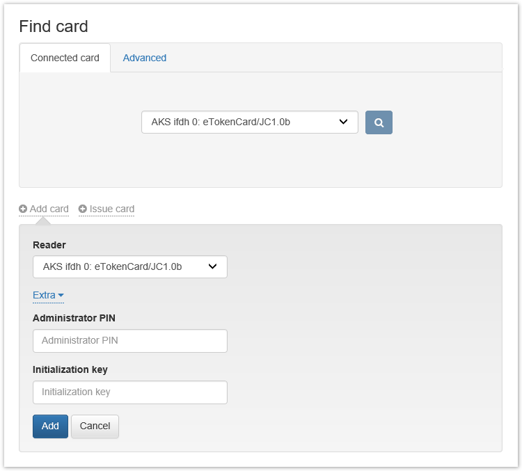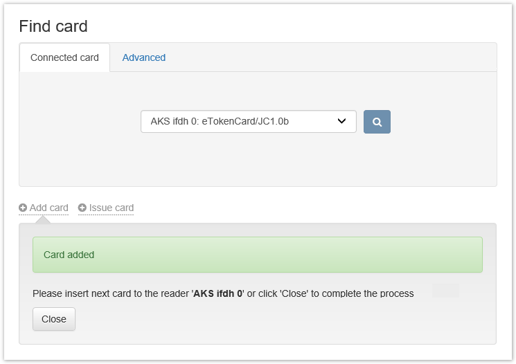 Connect the smart card to a computer, set the Administrator PIN code, if required, and click Add Card. After adding the smart card, click Close. Smart cards can also be added automatically by connecting them one by one to the same reader.