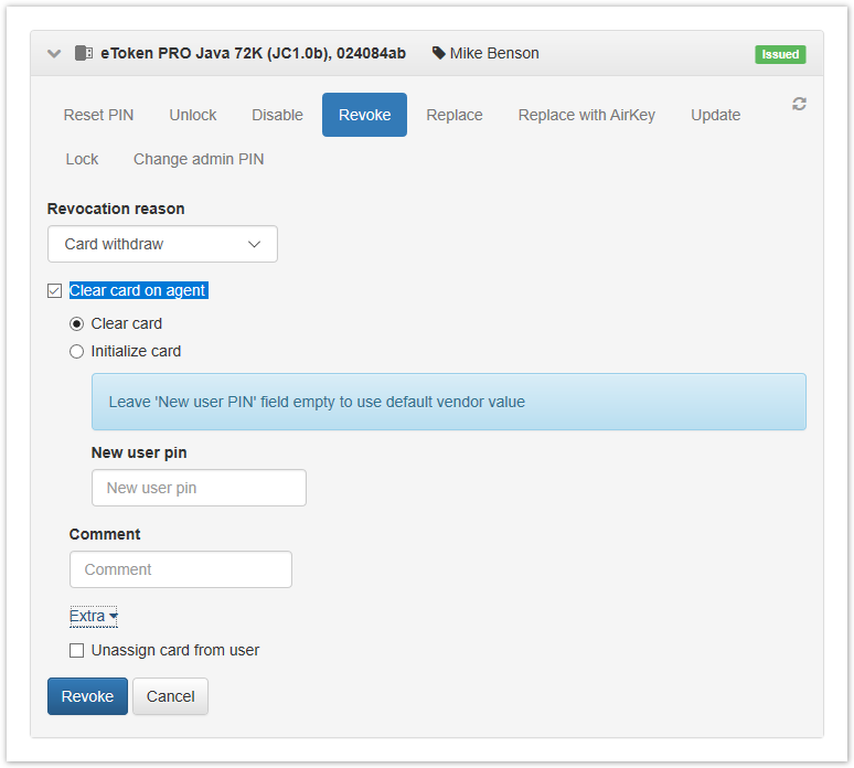 If the device is to be unassigned from the user, then click Extra and enable the Unassign card from user option.