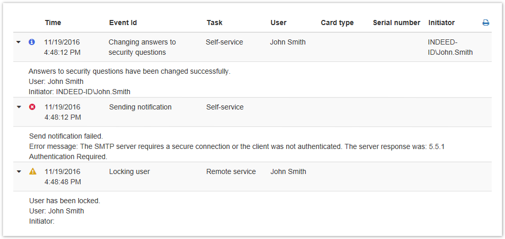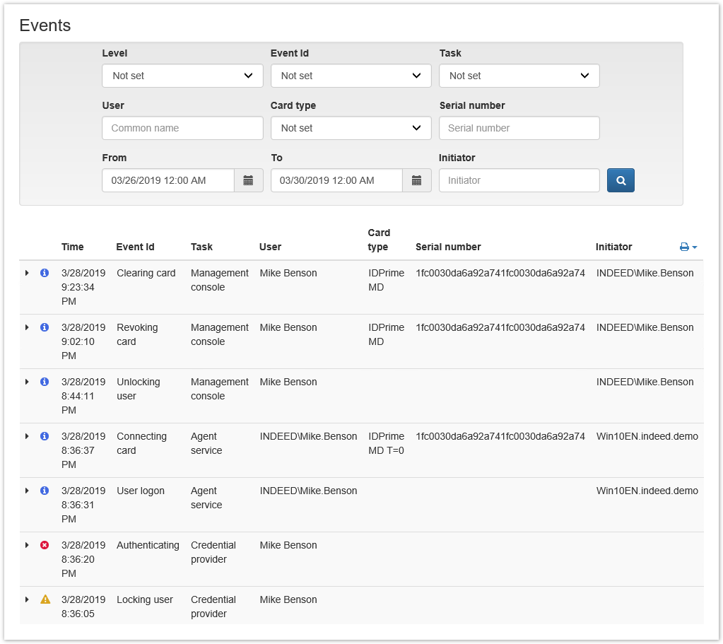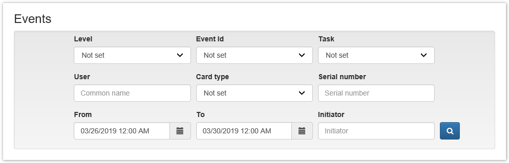 Records of all operations in the Indeed Certificate Manager applications are kept in the Indeed CM/Operational log on Indeed CM server. The Events section allows the system administrator or operator to request the necessary information from the log using filters.