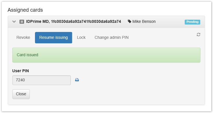 6. After approval the certificate state changes to Accepted. Then you can continue card issuance (the Resume issuing button becomes active).