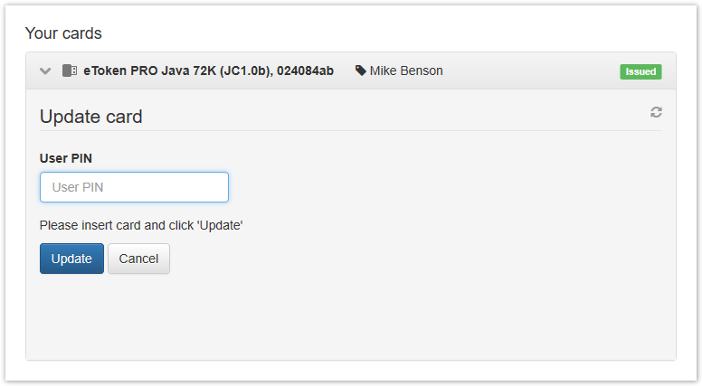 2. Connect the card to a computer, enter your PIN code and click Update.