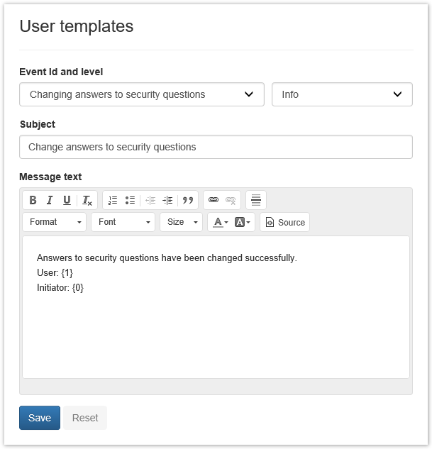 The tab defines the templates of email notifications of Indeed Certificate Manager system events to be sent to users. You can define one template for each notification in a policy of device usage. The basic variant of email notification contains the following information: