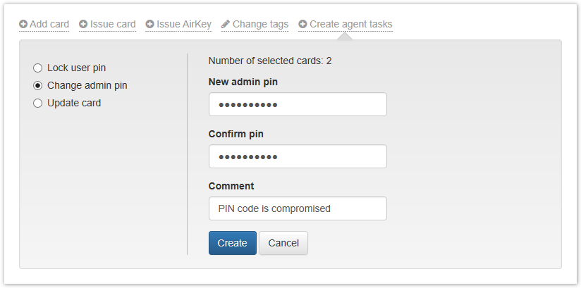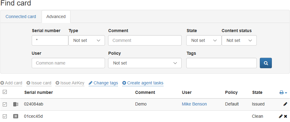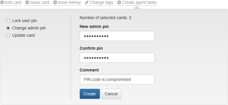 The bulk tasks are then assigned to selected smart cards and are performed as soon as the smart cards in question are connected to Indeed CM Agents. To create a bulk task, switch to Cards tab, select the necessary smart cards and click Create agent tasks.
