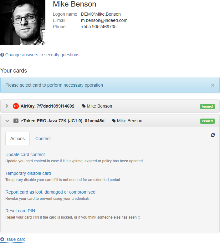User data (name, name to login into domain, email address, phone number and photo) is added to the Indeed Certificate Manager system automatically from the Active Directory profile. Changes made to Active Directory profile are immediately displayed in Self Service as well.