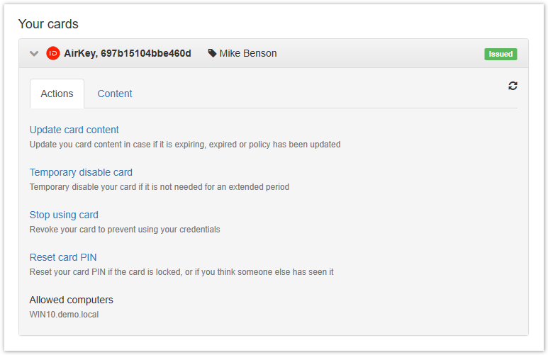 After a card is issued, it is automatically connected to the user workstation. The list of allowed computers is displayed in AirKey card properties.