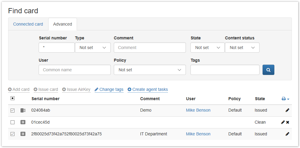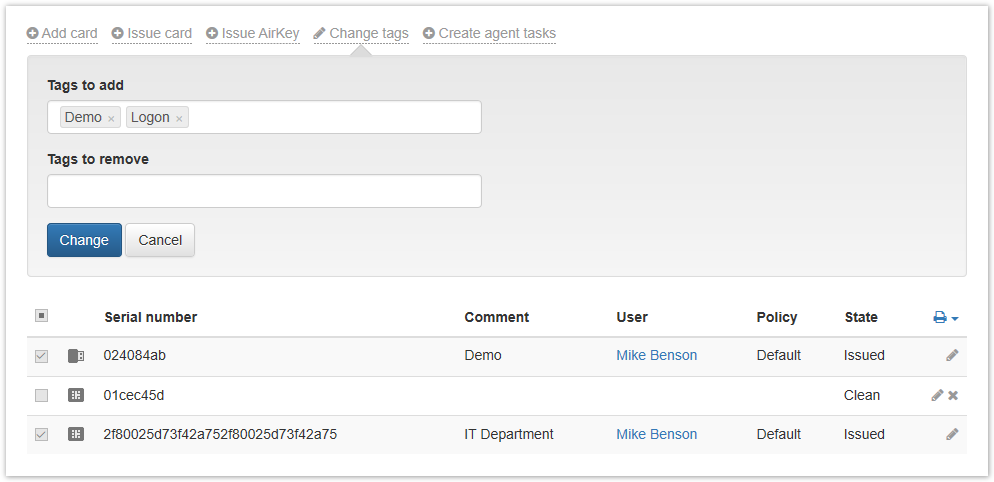 To add or remove tags, go to the Cards tab of the Advanced Search section, select the required smart cards and click Change tags.
