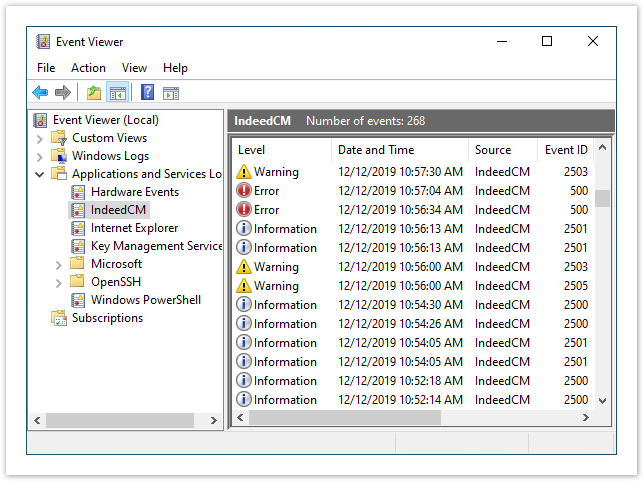 To view Agent events, filter out log contents by one of the services in Events section of Indeed CM management console.