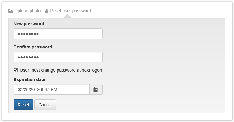To reset the password, click Reset user password, set the new value, option of mandatory change upon the first login (if required) and confirm password: