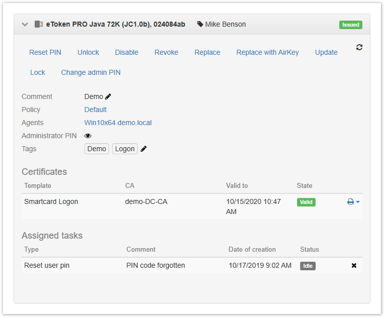 Agents carry out smart card and content management via tasks. If a task does not require user participation, then it can be executed by any Agent. Otherwise it can be performed only by assigned agent - for example, when answer to security questions is required to unlock the smart card.