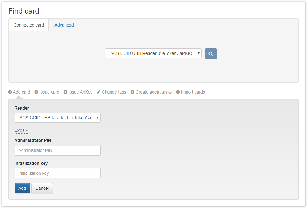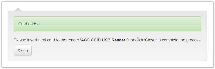 Connect the smart card to a computer, set the Administrator PIN, if required, and click Add. After adding the smart card, click Close. Smart cards can also be added automatically by connecting them one by one to the same reader.