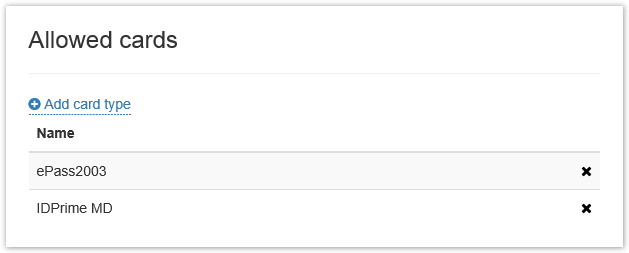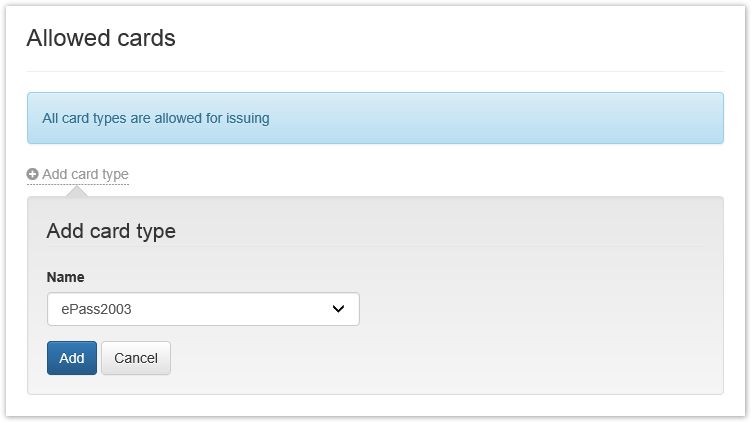 By default, issue is allowed for all smart card types added to Indeed Certificate Manager. To set up the policy to issue smart cards of a certain type, click Add card type.