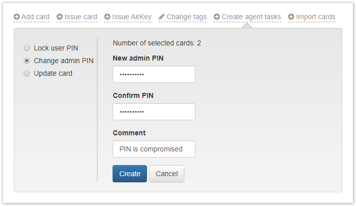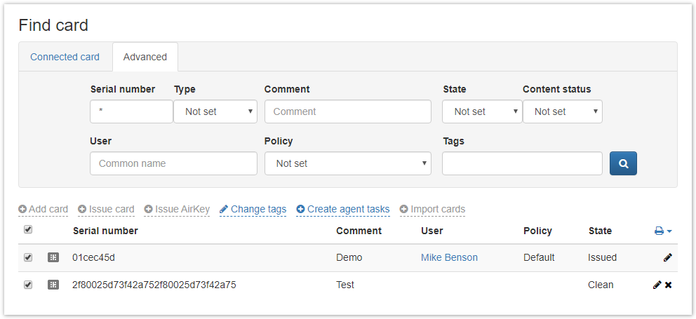 The bulk tasks are then assigned to selected smart cards and are performed as soon as the smart cards in question are connected to Indeed CM Agents. To create a bulk task, switch to Cards tab, select the necessary smart cards and click Create agent tasks.
