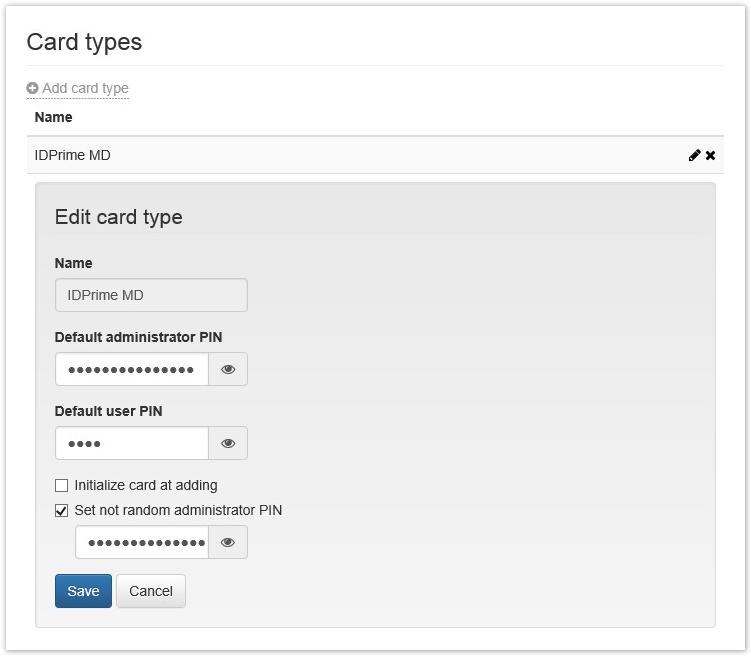 A card type file contains default predefined values of administrator and user PIN. These values can be changed after the card type file is added to Indeed CM. To edit a card type, select the required one in the list and click